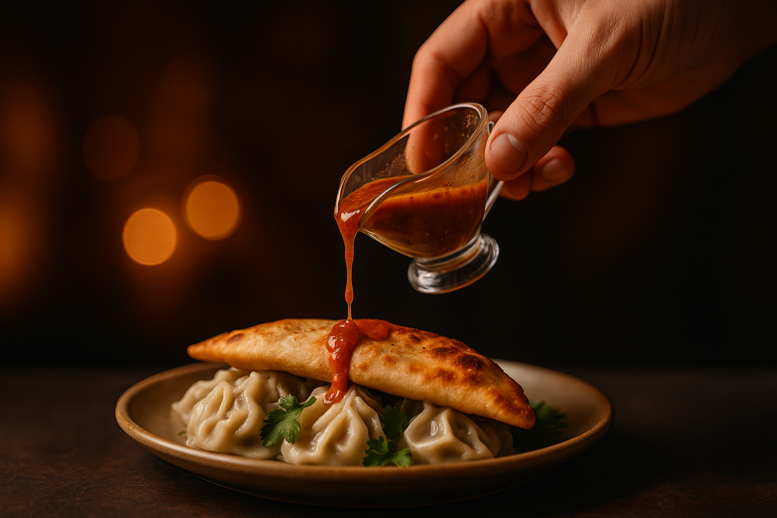 Gedämpfte Teigtaschen mit Rinderhack & Linsen, Joghurt-Knoblauch-Soße.